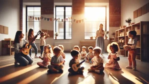 - Piosenka powitalna 'Witamy Was, Mamy’ (3 minuty) – wszystkie dzieci spiewaja klasyczna piosenke powitania. Nauczycielka gra na gitarze lub uzywa nagrania.